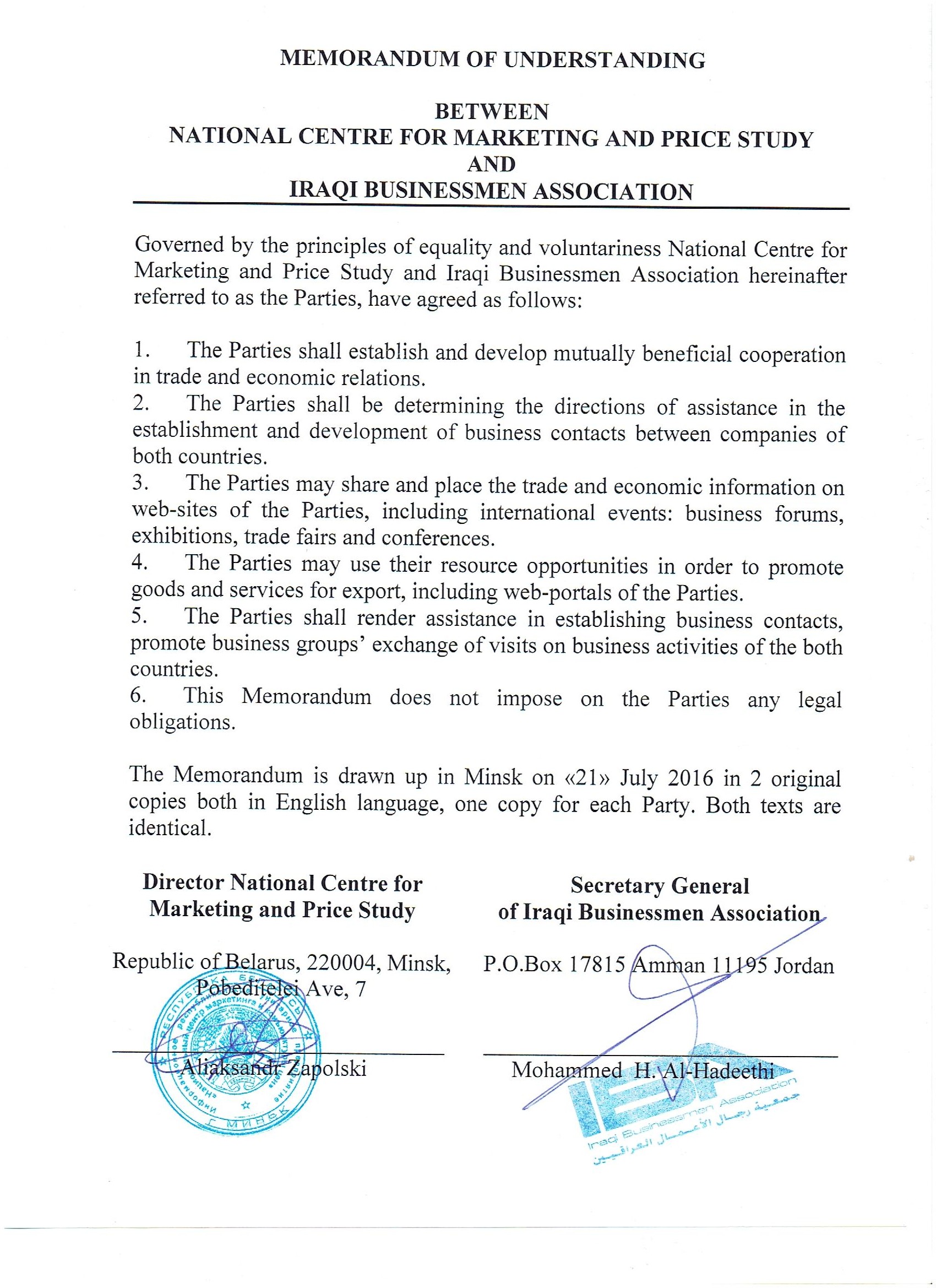 MEMORANDUM OF UNDERSTANDING BETWEEN NATIONAL CENTRE FOR MARKETING AND PRICE STUDY AND IRAQ BUSINESSMEN ASSOCIATION